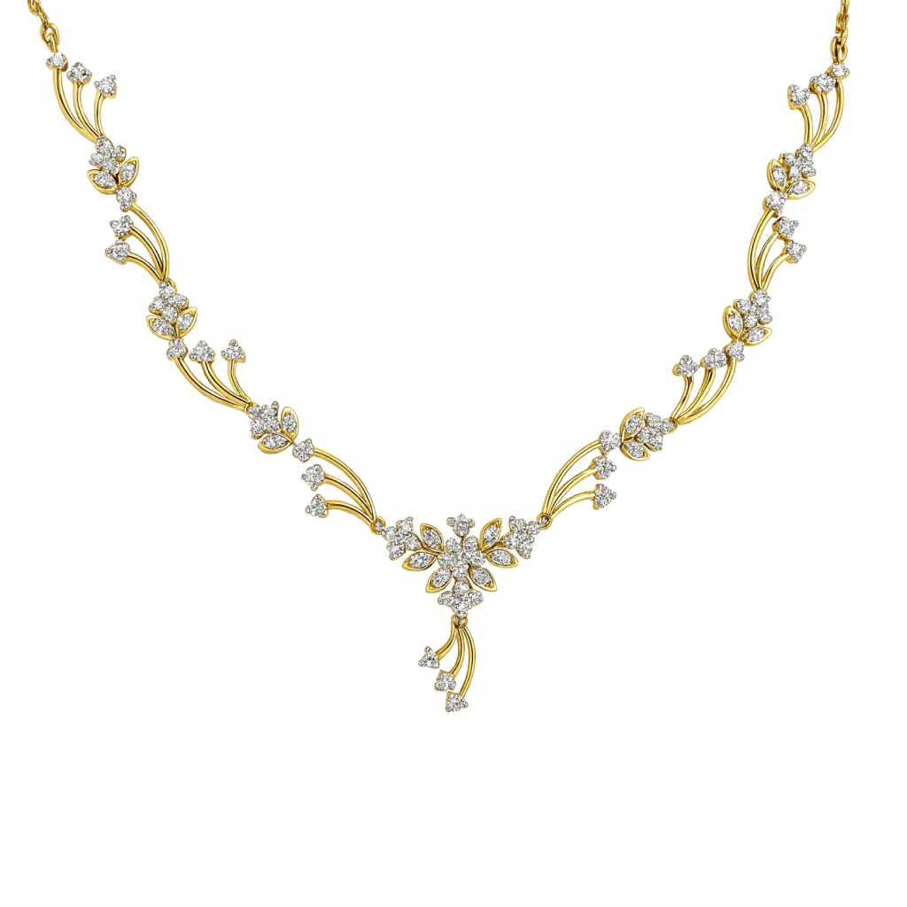 Floral bridal elegance highlights the Bridal Flower Diamond Gold Necklace, showcasing delicate flower-inspired diamond work in 18 KT gold. A graceful choice for brides who love romantic and detailed jewellery styling.