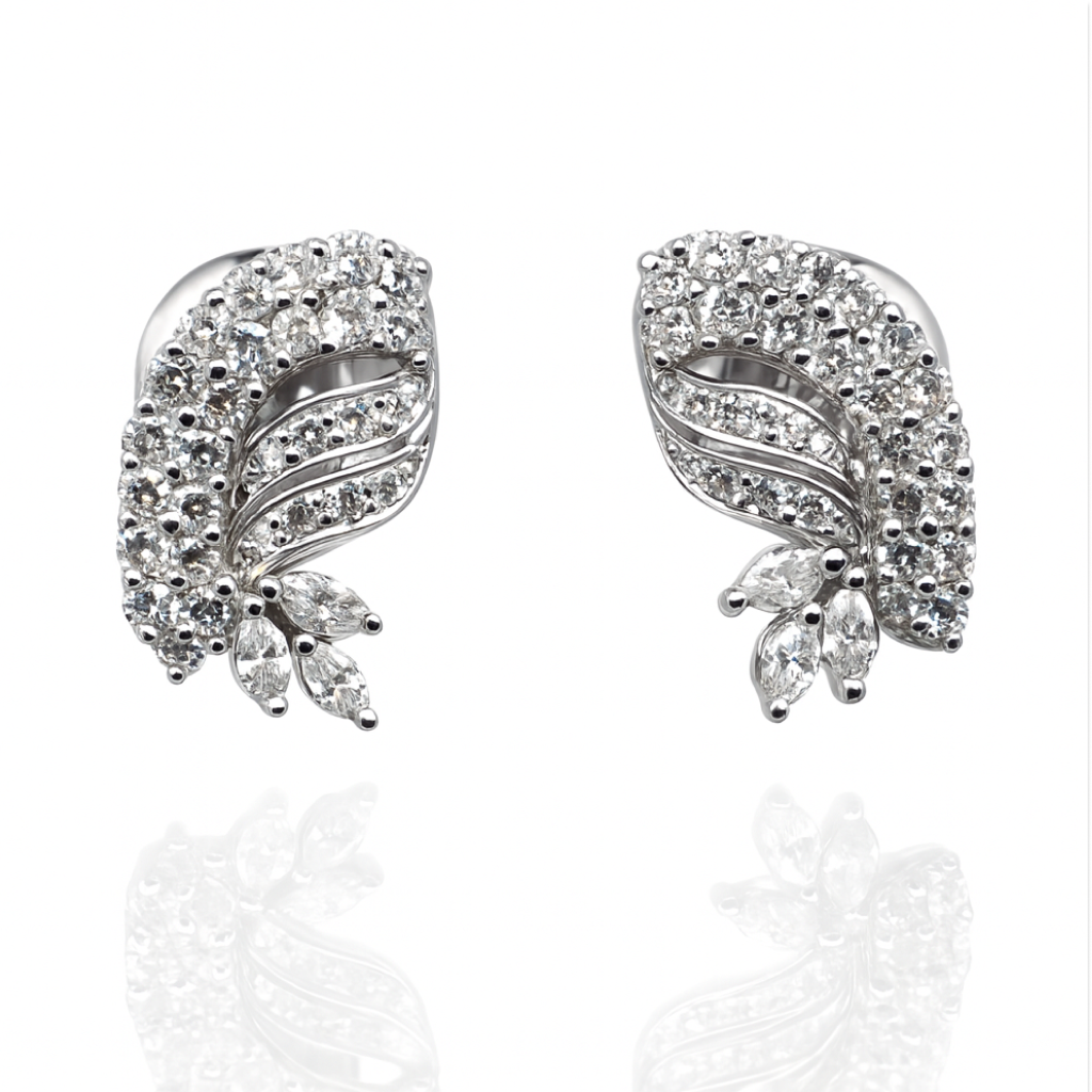 Drawing inspiration from the beauty of nature, these 18 KT gold diamond curved leaf earrings showcase a lovely leaf design adorned with shimmering diamonds.Ideal for sophisticated styling, these diamond leaf earrings in 18 KT gold bring a polished and modern flair to any outfit.