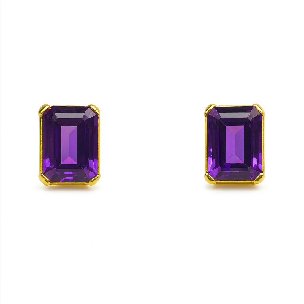 Present a touch of elegance with these 18 KT Gold Emerald-Cut Amethyst Stud Earrings, featuring vibrant purple amethyst stones cut in a sleek emerald shape. They are great for formal gatherings or for adding a luxurious flair to your daily attire.